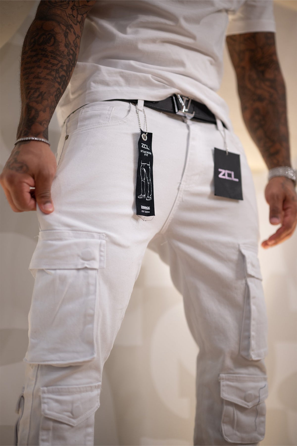 Vortex Cargo Stacked Denim (White) - Zamage